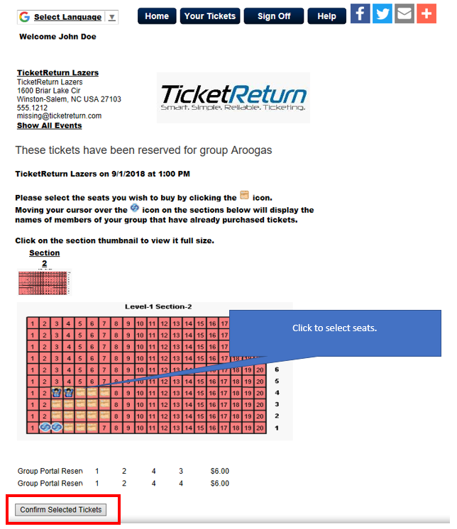 2. After signing in, you will see the tickets from which you can select. Click the seats that you want to purchase and click Confirm Selected Tickets.