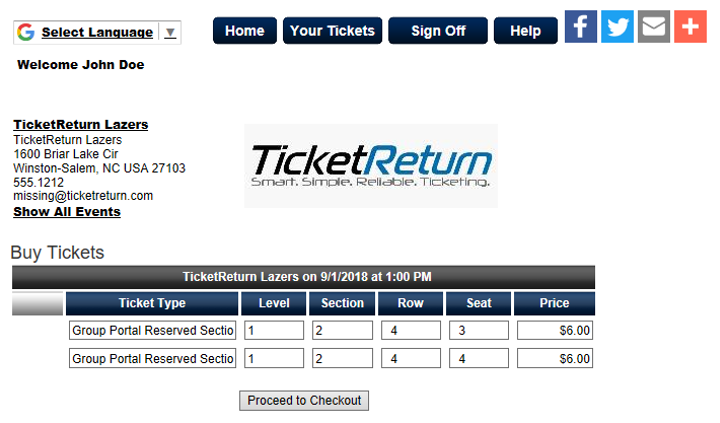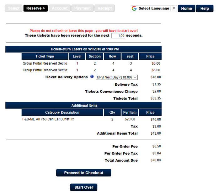 3. The next page appears listing the tickets that you selected. Click Proceed to Checkout.