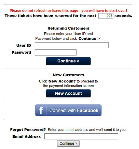 6. The next page appears. You can either log in with an existing TicketReturn account or you can create a new one. The remainder of the procedure is completed the same as a regular ticket purchase. Once you have purchased the group portal tickets, the tickets are moved from the group portal into your account.